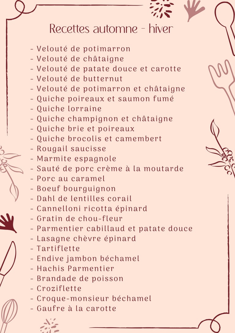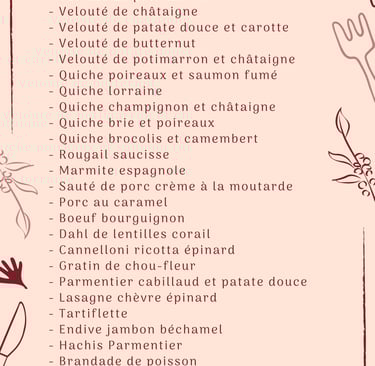 Les recettes peuvent être modifiées si allergies ou selon les goûts.